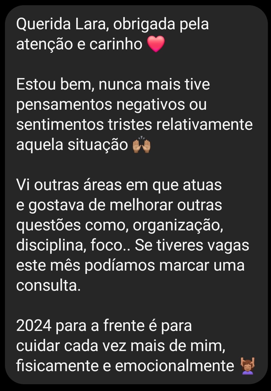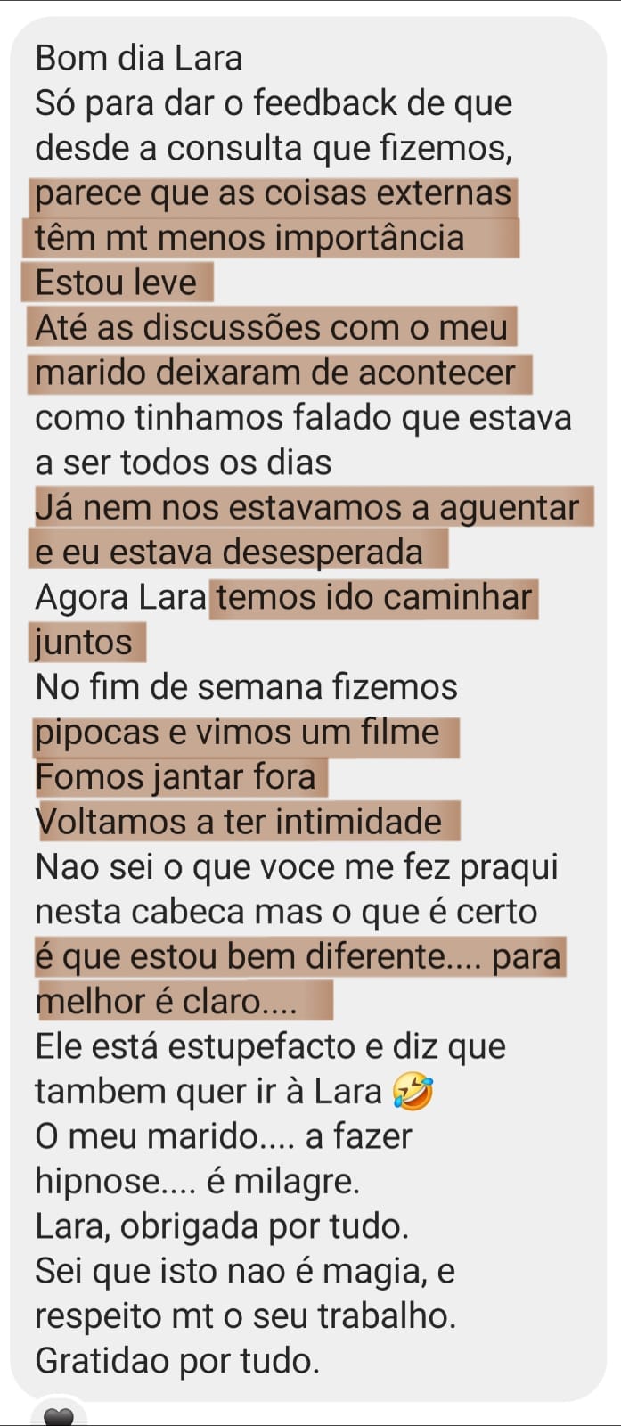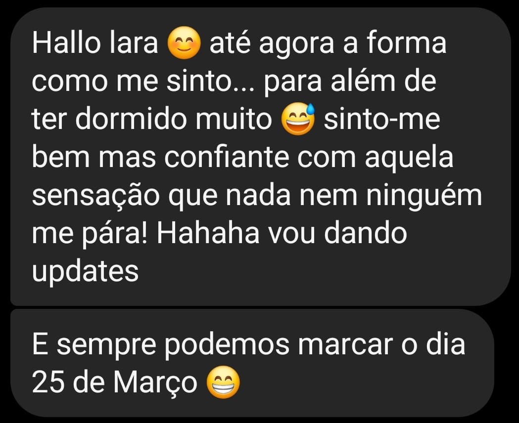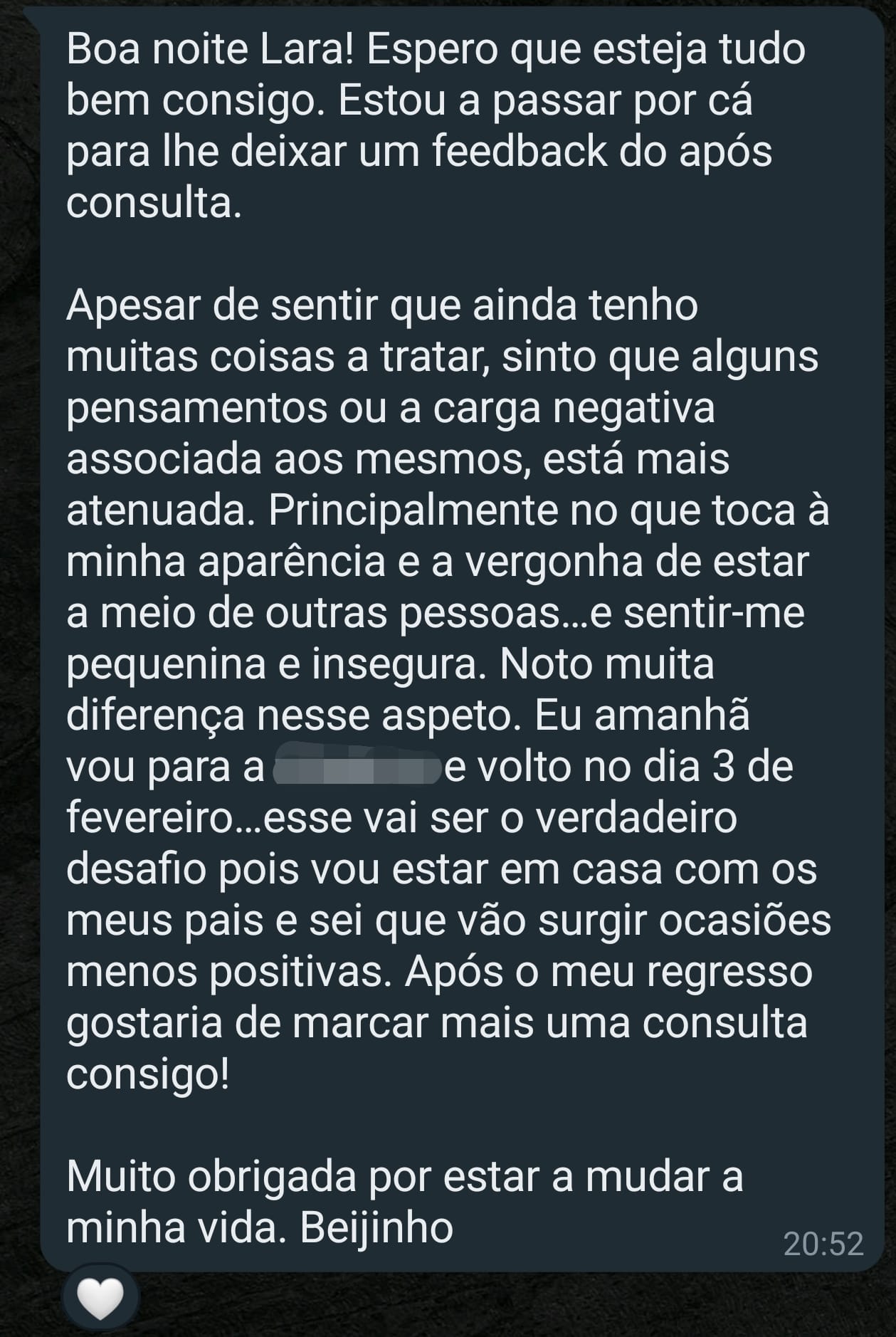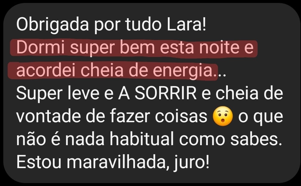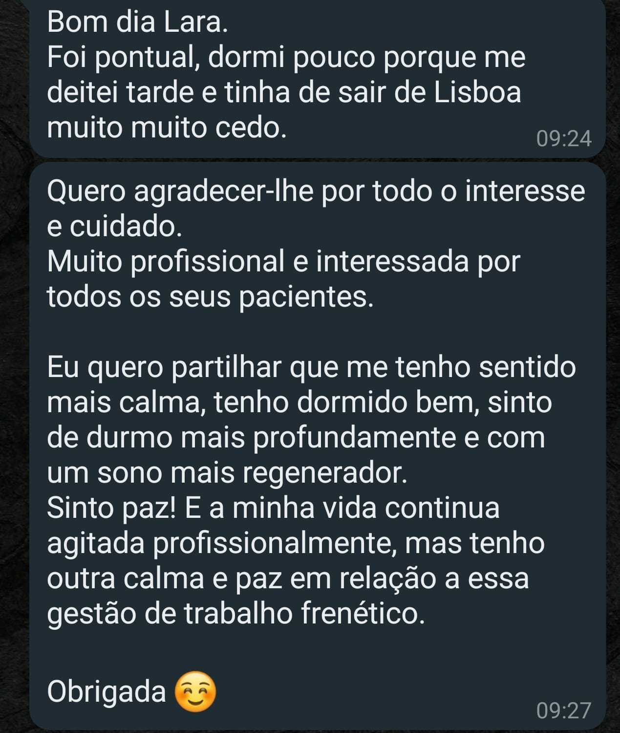 Boa noite Lara, vim só dizer que desde a consulta sinto-me muito mais focada no meio trabalho. Muito mais produtiva e com mais vontade de avançar. Antes ficava extremamente stressada, distraia-me imenso e com muita facilidade e depois acabava por acumular tarefas e nunca as conseguia concluir. Agora aplico as técnicas que me ensinou, faço a lista de tarefas para o dia e praticamente cumpro sempre no mínimo 90% do planeado. A minha produtividade no trabalho e a minha organização em termos pessoais, melhorou drasticamente. Para além da leveza que sinto, da sensação de paz interior e energia... sabe? É muito bom. Quero marcar mais uma consulta consigo assim que tiver vaga pff.
