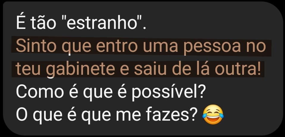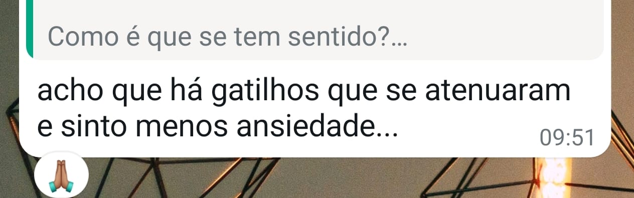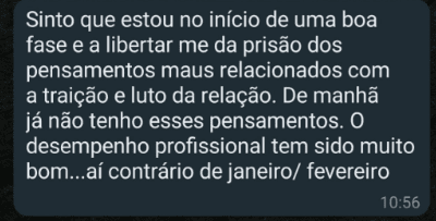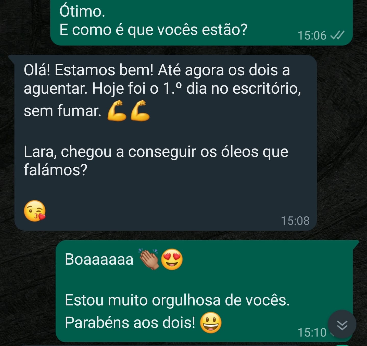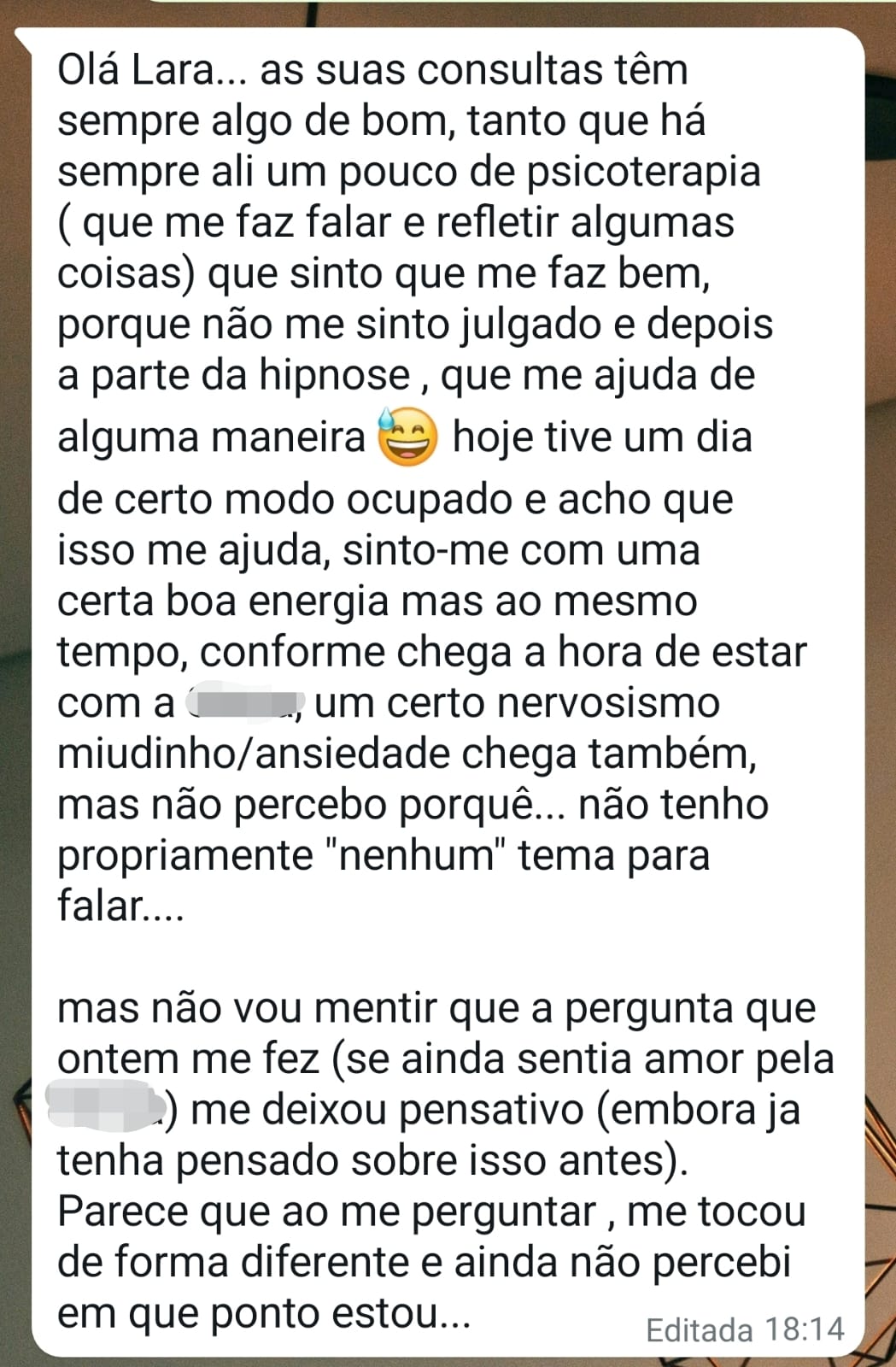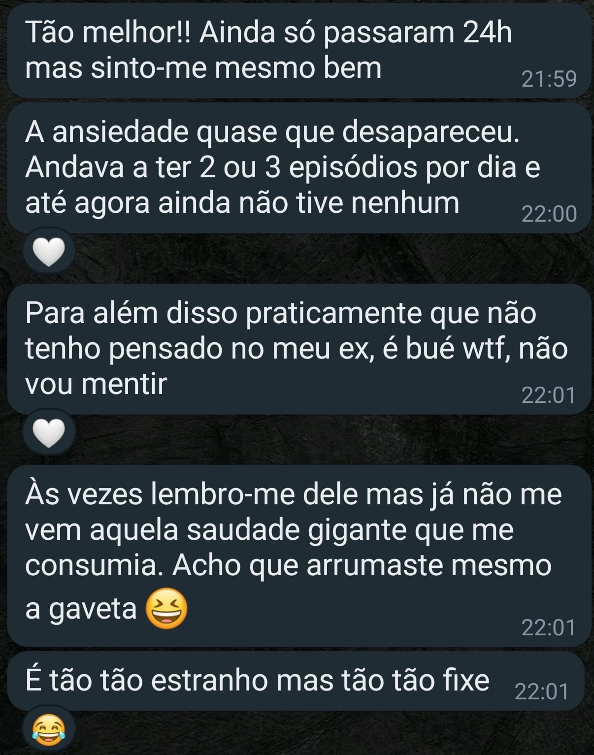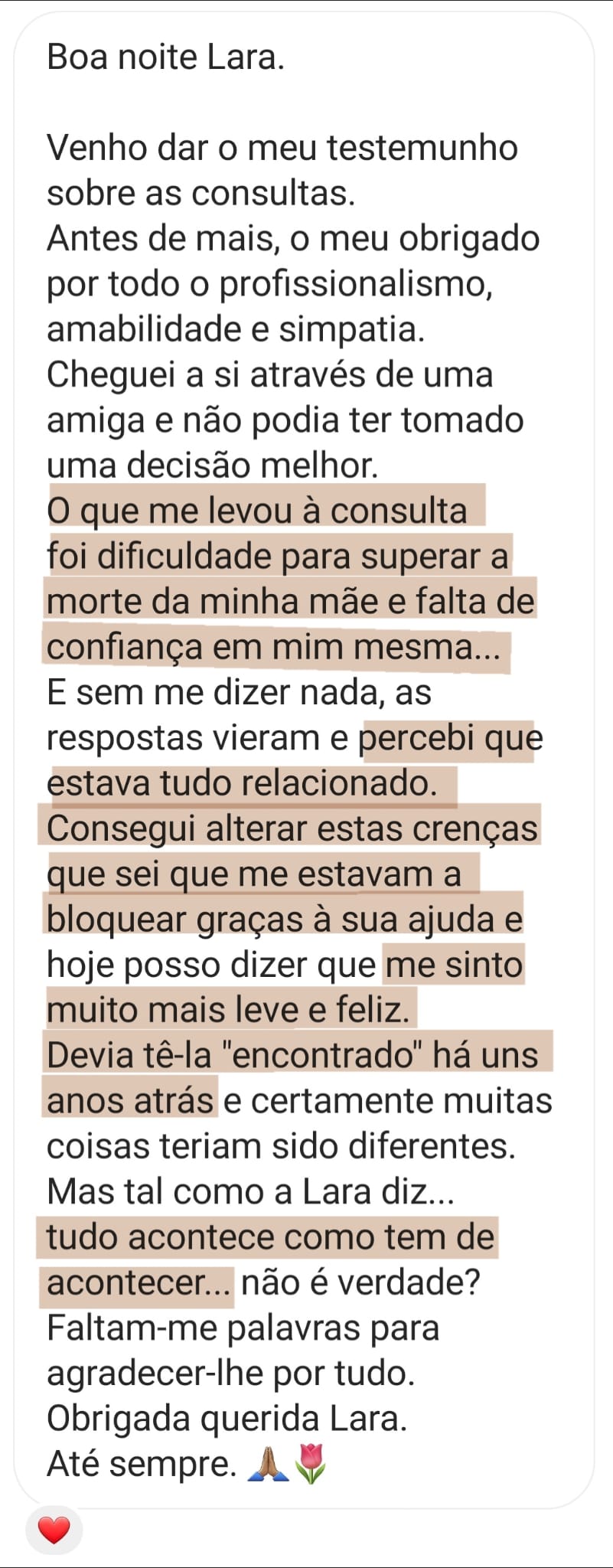Boa noite Lara, vim só dizer que desde a consulta sinto-me muito mais focada no meio trabalho. Muito mais produtiva e com mais vontade de avançar. Antes ficava extremamente stressada, distraia-me imenso e com muita facilidade e depois acabava por acumular tarefas e nunca as conseguia concluir. Agora aplico as técnicas que me ensinou, faço a lista de tarefas para o dia e praticamente cumpro sempre no mínimo 90% do planeado. A minha produtividade no trabalho e a minha organização em termos pessoais, melhorou drasticamente. Para além da leveza que sinto, da sensação de paz interior e energia... sabe? É muito bom. Quero marcar mais uma consulta consigo assim que tiver vaga pff.