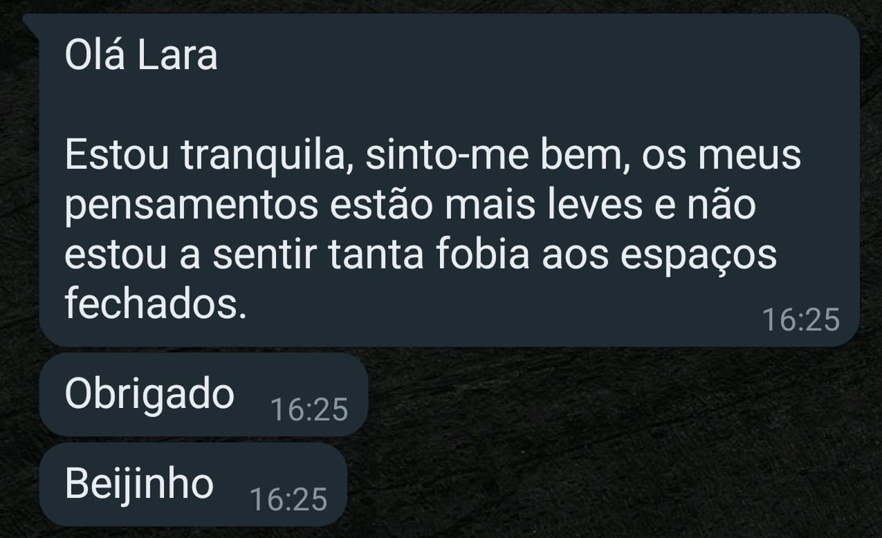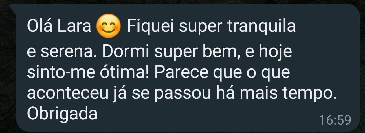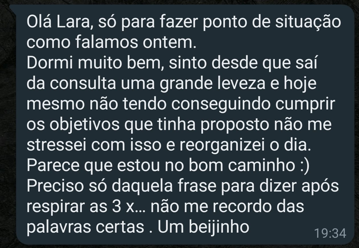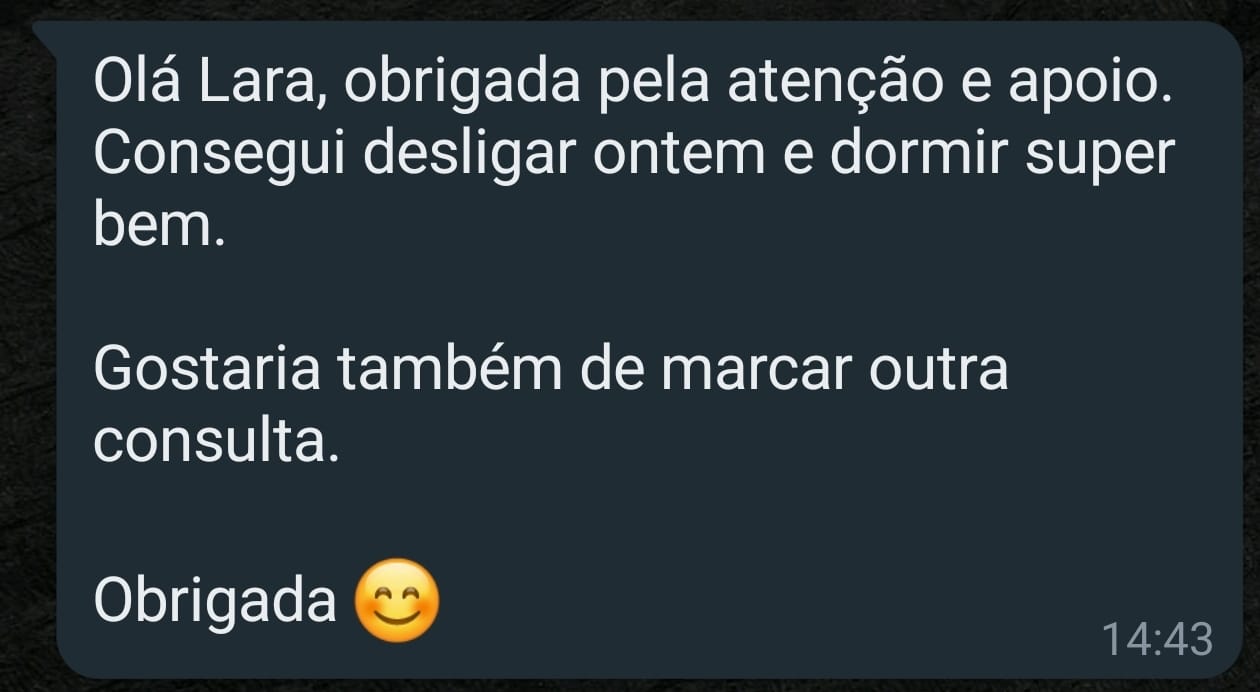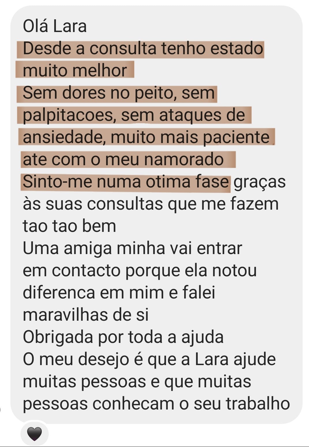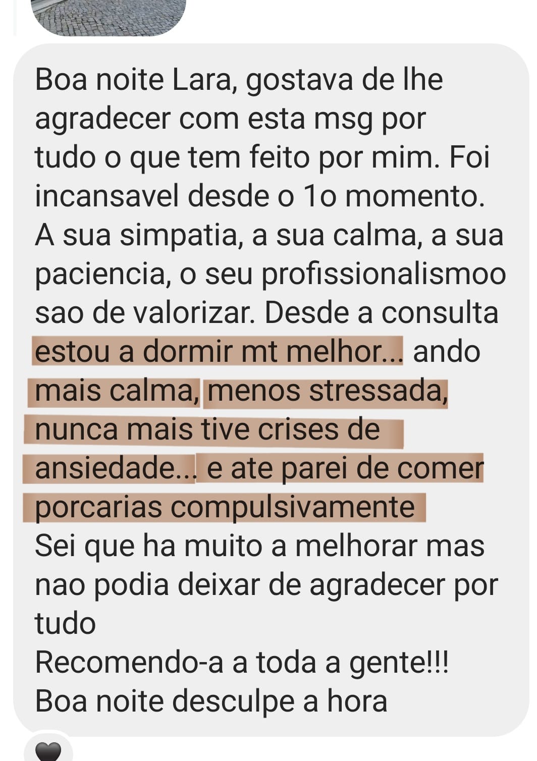 Dra. Lara você foi um anjo que apareceu na minha vida. Não voltei a ter crises de ansiedade desde a última consulta. Tenho aplicado a técnica que me ensinou e ouvido os aúdios. A sua voz acalma-me tanto. Obrigada por todo o profissionalismo e paciência. Um beijinho,