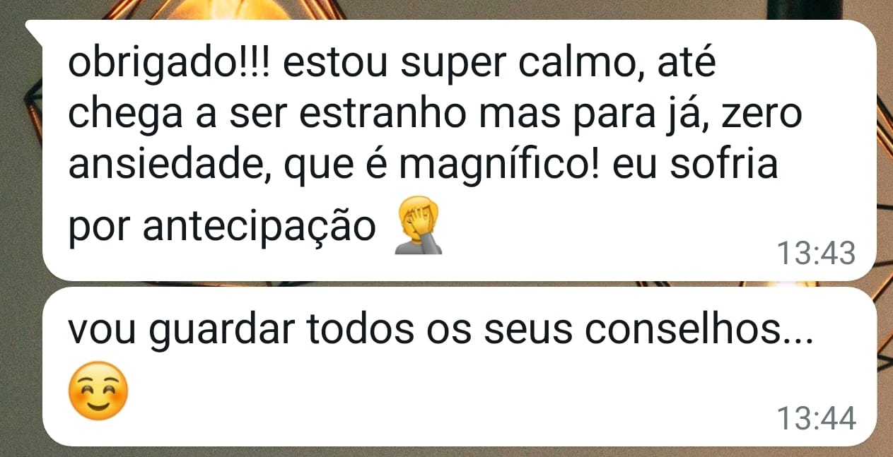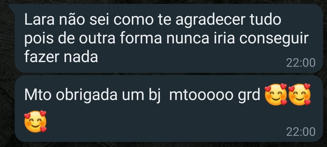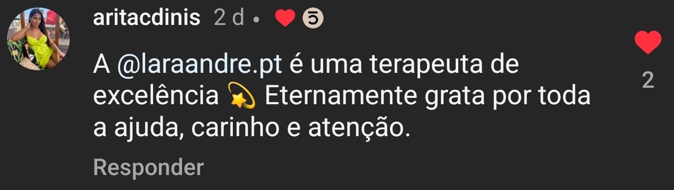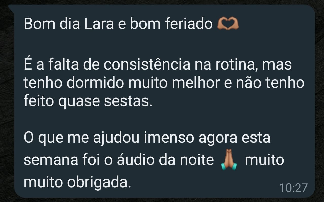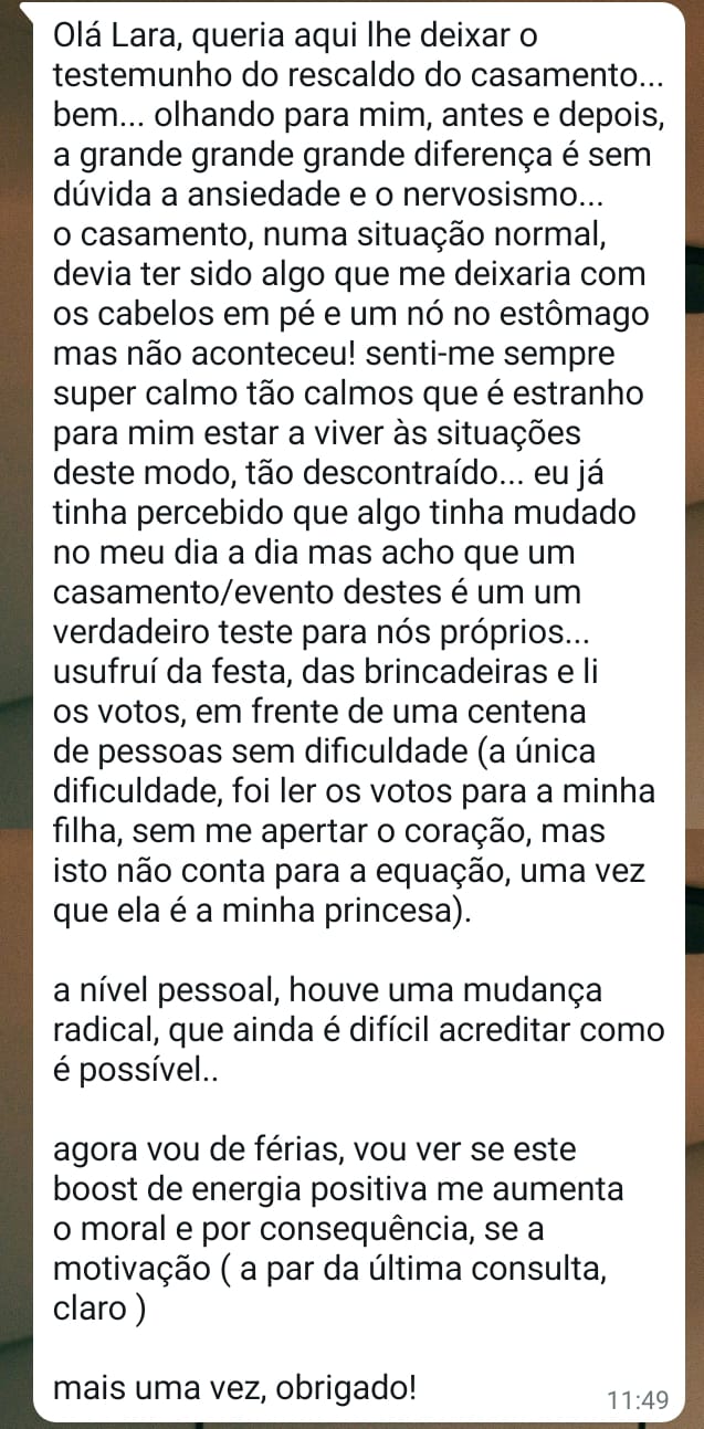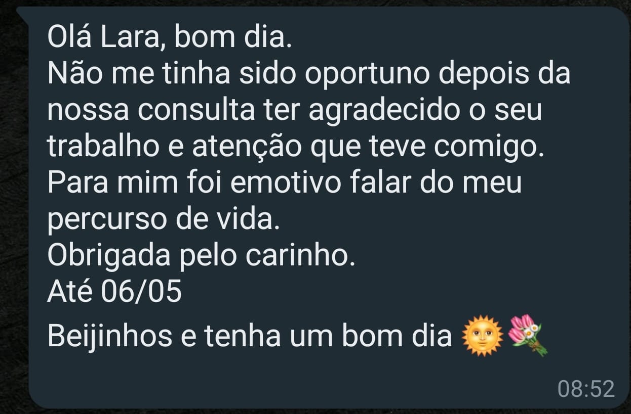 Dra. Lara você foi um anjo que apareceu na minha vida. Não voltei a ter crises de ansiedade desde a última consulta. Tenho aplicado a técnica que me ensinou e ouvido os aúdios. A sua voz acalma-me tanto. Obrigada por todo o profissionalismo e paciência. Um beijinho,
