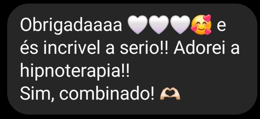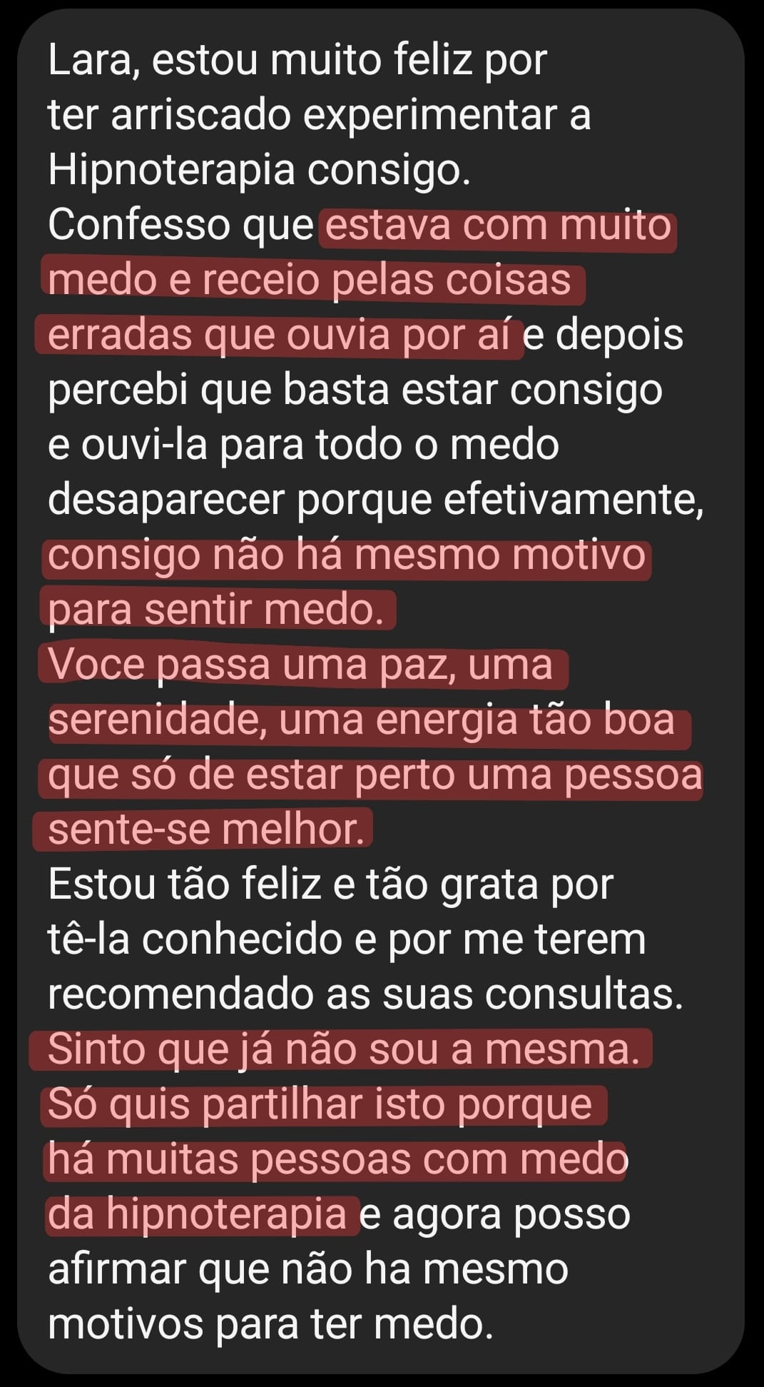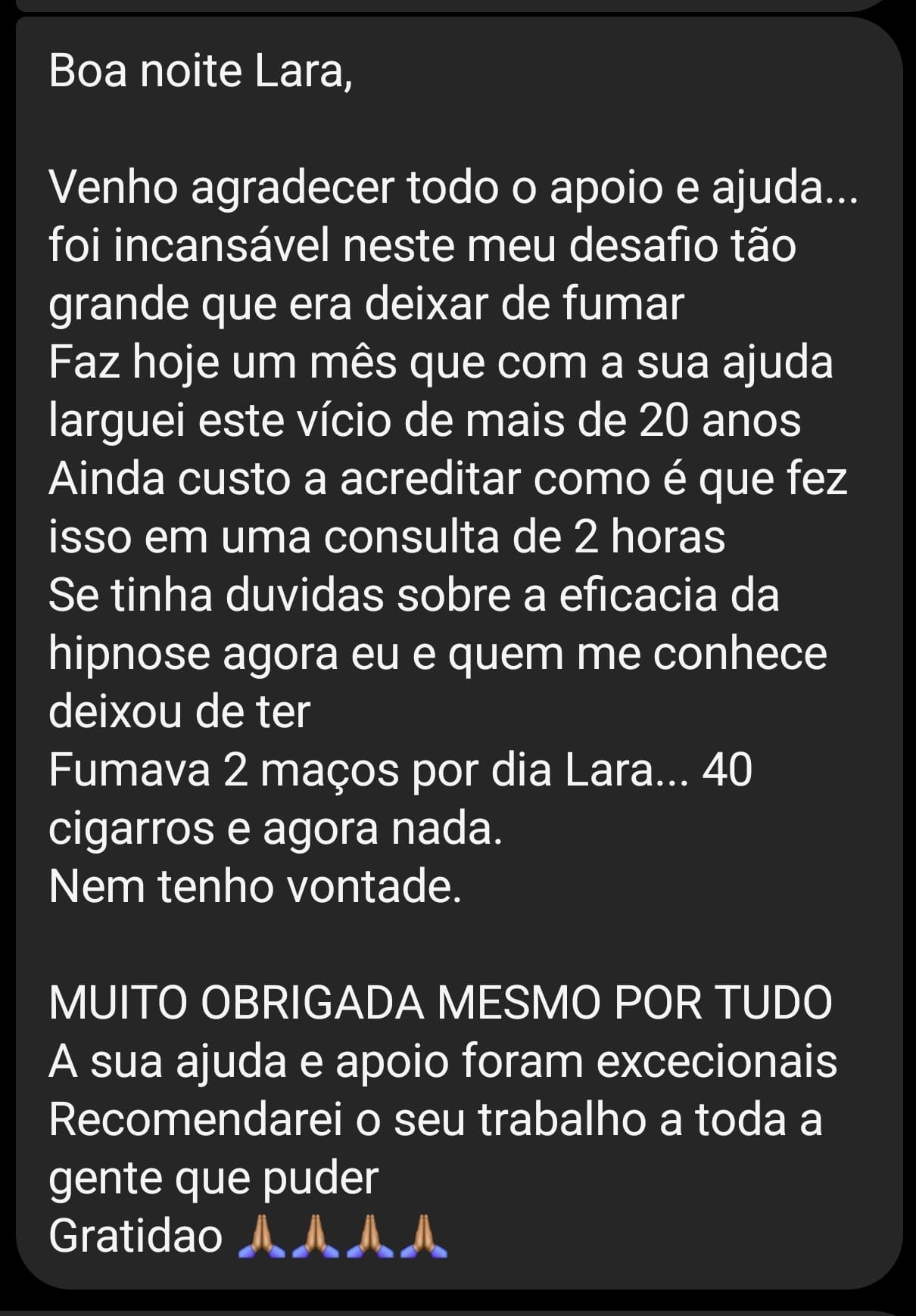 Estou surpreendida com os efeitos que a Hipnoterapia tiveram em mim. Estou muito feliz com o resultado e sei que é só o início. Recomendo muito. Muito obrigada Lara!